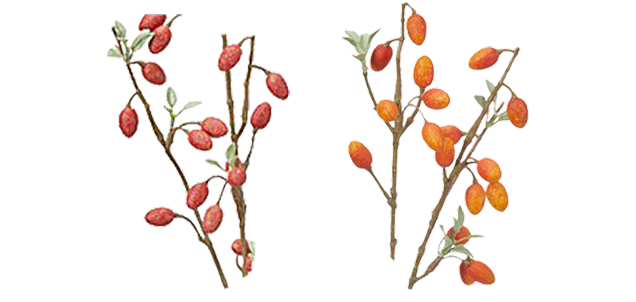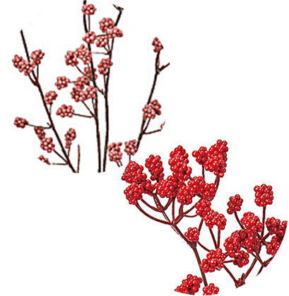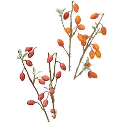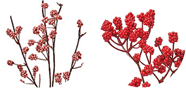 一方で、グミの木(A-48031とA-48032)は実の大きさが2cmと存在感があり、アレンジの主役としてぴったり。他のベリー系と合わせることでより立体感のある 仕上がりになりおすすめです。